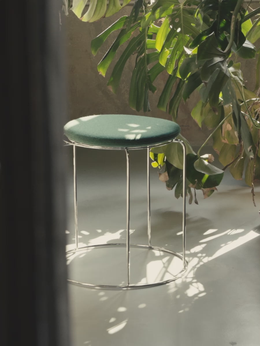 Pehmuste Wire Stool VP11 jakkaraan myydään erikseen. Jakkara on valmistettu ruostumattomasta teräslangasta, joka on taivutettu ympyröiksi ja pistehitsattu yhteen. Keskilevy on valmistettu magneettisesta teräksestä, joten istuintyyny voidaan kiinnittää. |